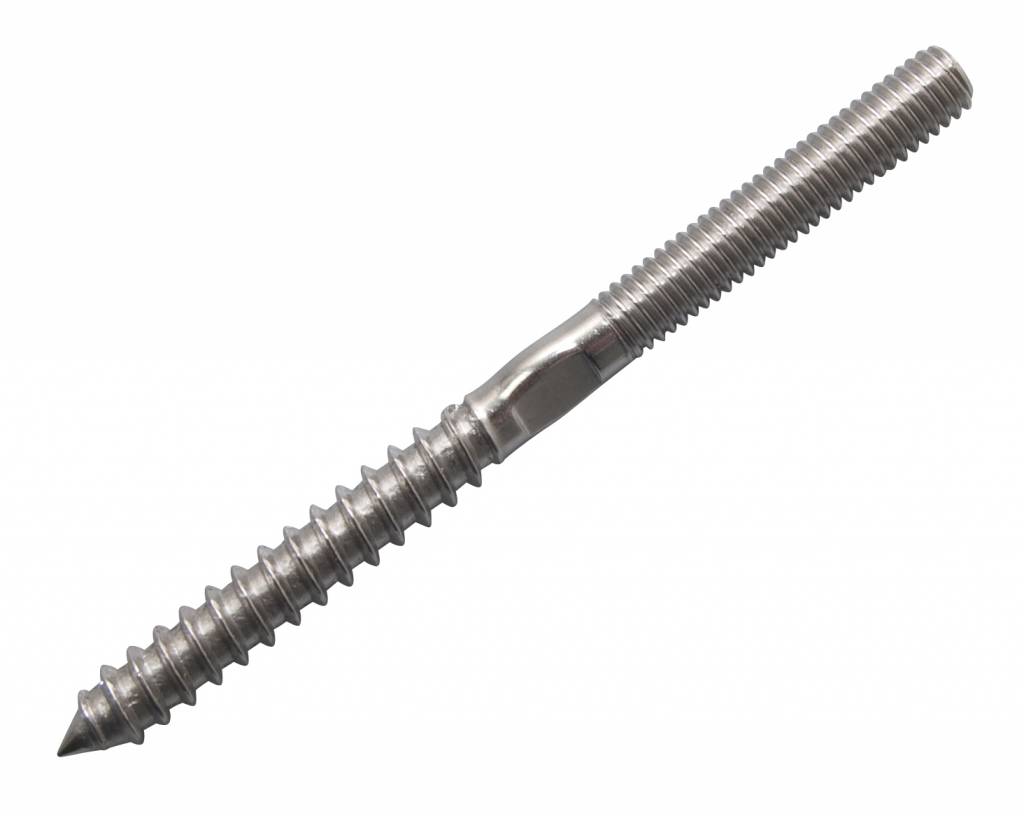 Bij deze optie maken we gebruik van stud terminals. Eerst kun je met pluggen een duoschroef plaatsen. Een duoschroef is een schroef met houtdraad en de andere zijde links of rechtsdraaiend metrisch draad. Door een linkse en een rechtse tegenover elkaar te plaatsen is het mogelijk de kabel op spanning te draaien op het schroefdraad. Kies hierbij voor een duoschroef M6 – per lijn heeft u 1 – linkse duoschroef en 1 – rechtse duoschroef nodig.